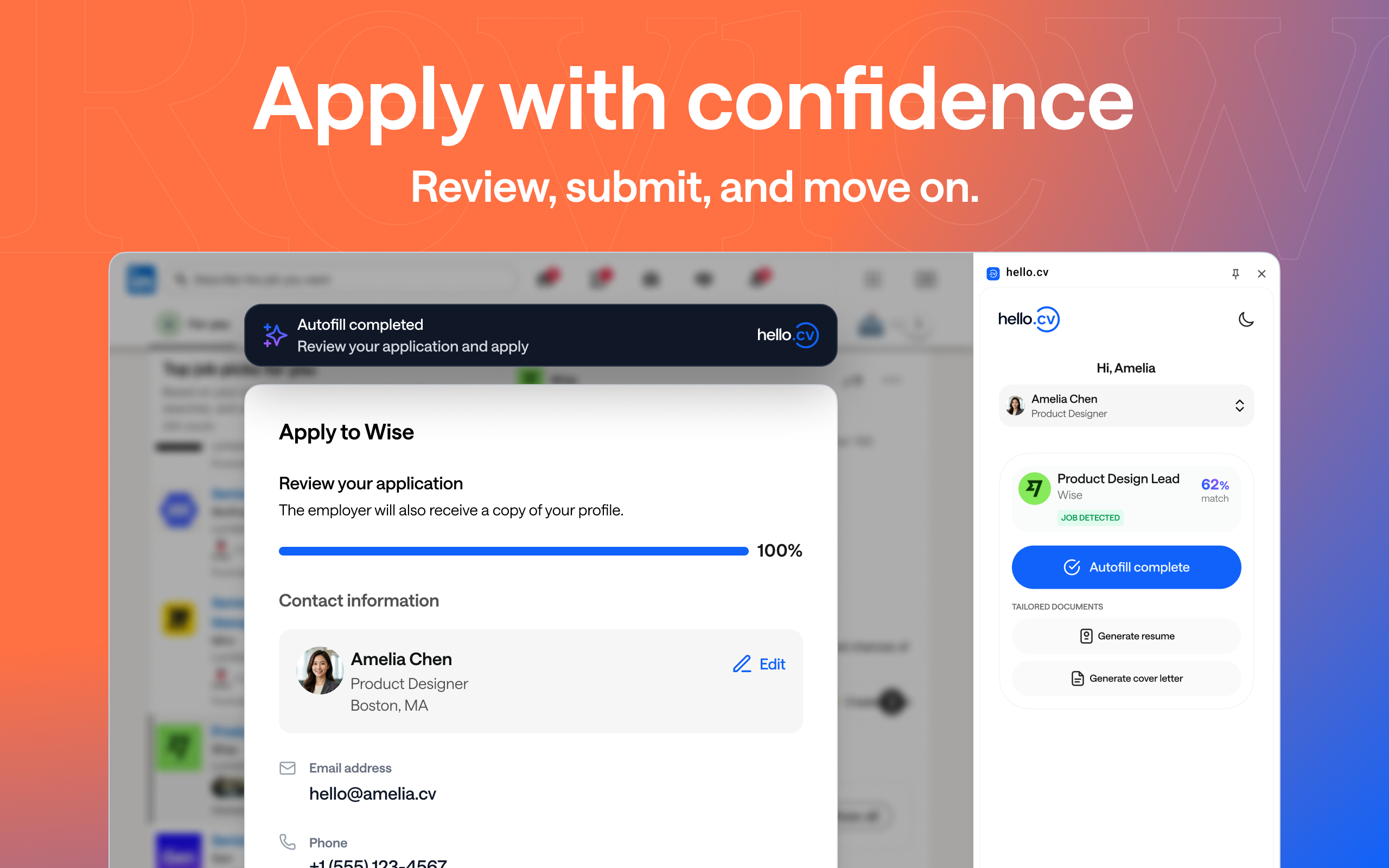 You're on a job posting (let’s say LinkedIn, Indeed, Workday, Greenhouse, or wherever the role lives) and you click through to apply. Instead of manually typing your name, contact details, work history, and education into each field, hello.cv Autofill detects the application form and fills it in from your profile. The information is already there. You just review it, make any role-specific edits you want, and submit.